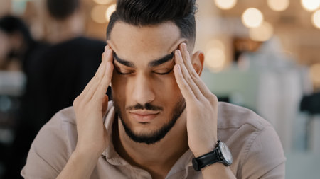 Portrait close up sad upset sick unhappy man unhealthy guy businessman has problem trouble massaging temples suffer headache depressed Hispanic Indian male suffering from migraine difficult job loss