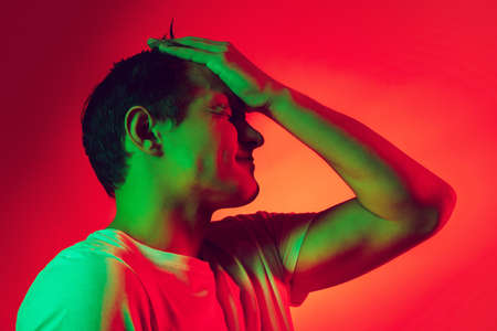 Disappointed. Caucasian mans portrait isolated on red studio background in multicolored neon light. Beautiful male model. Concept of human emotions, facial expression, sales, ad, fashion. Copyspace.