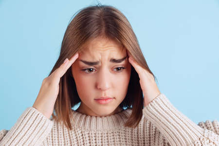 Depressed girl with migraine headache. Sad woman touches temples because of stress and despair in her life. Problems in life