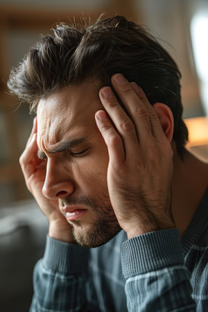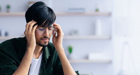 Young Man Holding His Head, Experiencing Stress While Sitting in a Modern Home Office