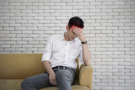 Businessman young asian having a migraine or headache, struggle with dizziness on sitting couch at home