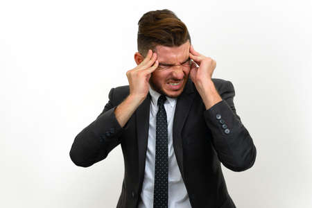 Ive been getting these headaches more often. Studio shot of a young man suffering from a headache while standing against a white background.
