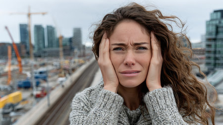 A young woman with curly hair stands in an urban setting, visibly stressed and expressing anxiety, with a construction site and skyline behind her.