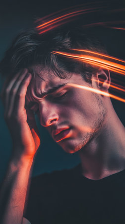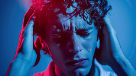 Young man holding his head in pain, reflecting sadness and despair. Emotions show stress, anxiety, and suffering. Abstract red background conveys illness