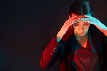 Young woman suffering from headache on colorful background in neon light. Headache concept.