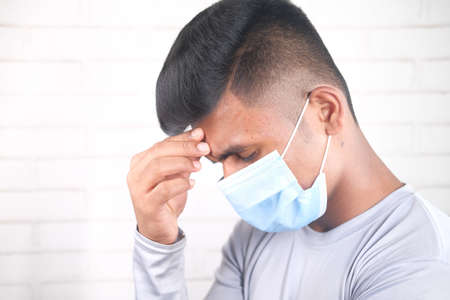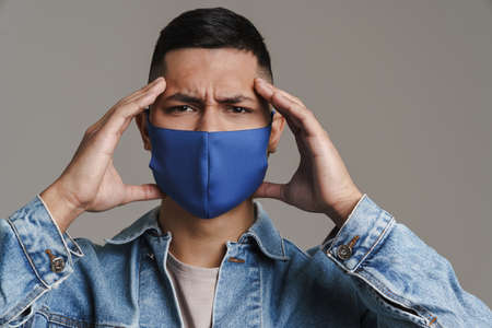 Unhappy guy with headache posing in medicine protective mask isolated over grey background