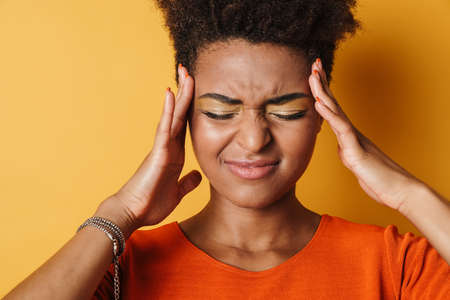 Image of unhappy african american woman with headache posing on camera isolated yellow background