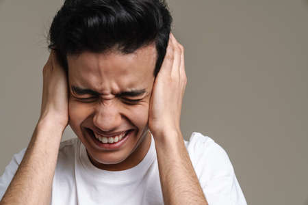 Unhappy hispanic man with headache frowning and holding his head isolated over grey background