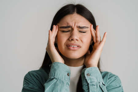 Young unhappy woman with headache rubbing her temples isolated over white background