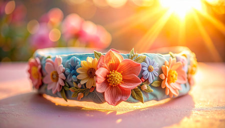 A fabric floral headband with colorful flowers sits in warm, soft sunlight with a bokeh background.