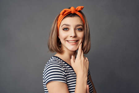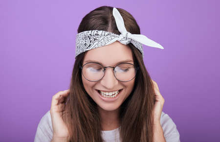 A cute girl with dark hair in a bandage on her head in white T-shirt, round glasses holds her hair and looks down shyly. Close-up portrait. Photo on the background.
