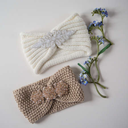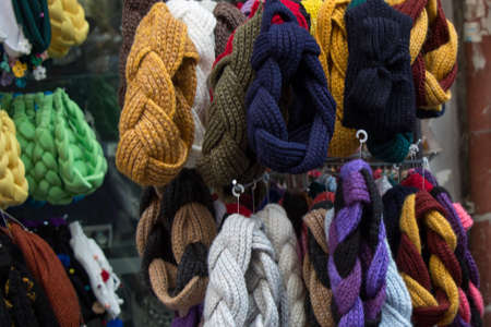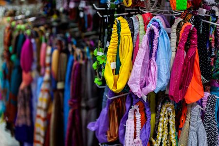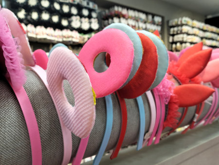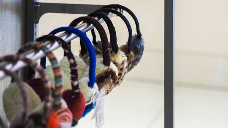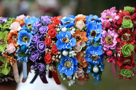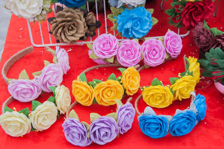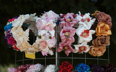 Beautiful accessory for girls, hoop decorated with decorative flowers of different colors at the exhibition