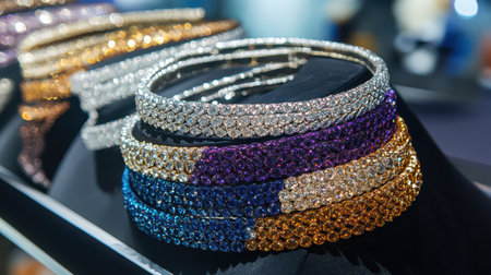 Shiny hairbands in various colors are stacked in an organized display at a local market event showcasing accessories.