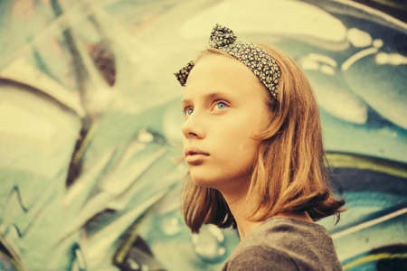 A portrait of a teenage girl with urban graffiti wall in the background. Toned image