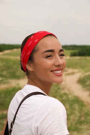 Young African American woman wearing colorful headwrap outdoors, Concept of beauty, culture, and nature. Copy space.