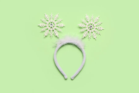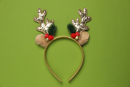 Beautiful reindeer headband on green background, top view. Christmas accessory