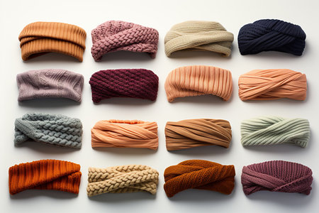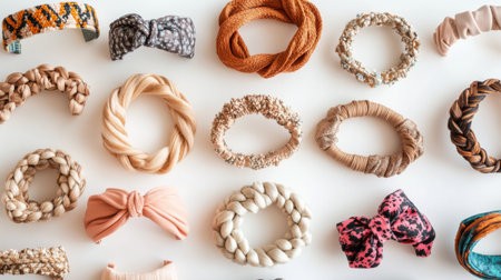 A flat lay of headbands in different styles, such as knotted, braided, and embellished, displayed on a white surface to highlight their diverse designs.