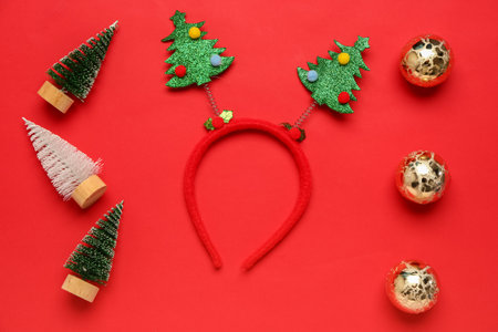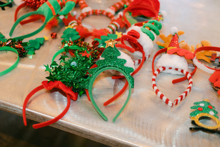 Festive holiday headbands with trees and reindeer, ideal for Christmas gatherings and decorations.