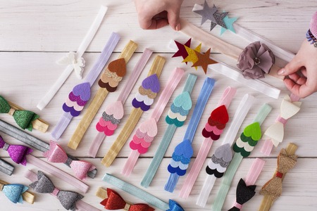 Set of colorful elastic decorated headbands. Bright handmade hair accessories with felt hearts decoration. Beauty, fashion, style concept