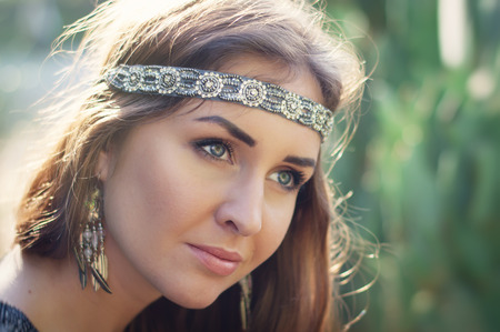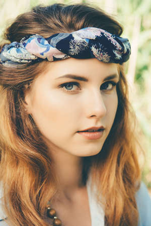 Beautiful hippie girl stands among the reeds in a summer sunny day. Spirit of freedom. Fashion shot. Bohemian, bo-ho style.