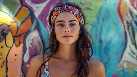 Stylish young woman with a headband, posing in front of a colorful mural in an urban area. Vibrant and lively atmosphere