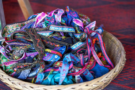 A basket of ethnic costume ribbons and accessories from Guangxi tailor shop