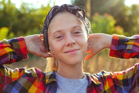 portrait of a blue-eyed girl with earrings and a scarf in front of the sun