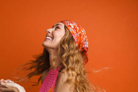 Young ginger woman wearing bandana laughing and looking upward isolated over orange wall