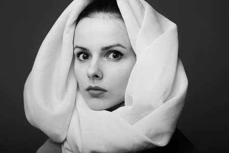 brunette with dark eyes, woman, head scarf, black and white portrait
