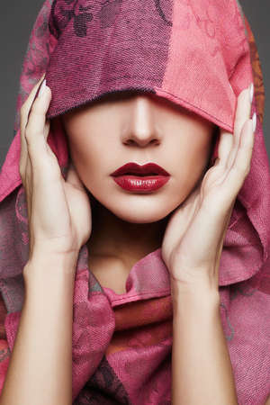 beautiful woman covers her face with a colored cloth.red lips girl.fashion islamic style woman in pink