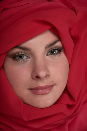 authentic mixed race boho fashion lady with makeup and silk turban over head in red studio background