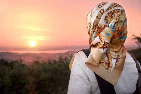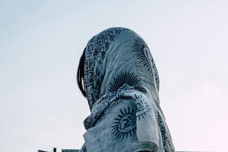 Beautiful, serious girl with a scarf on her head, staring at the sky.