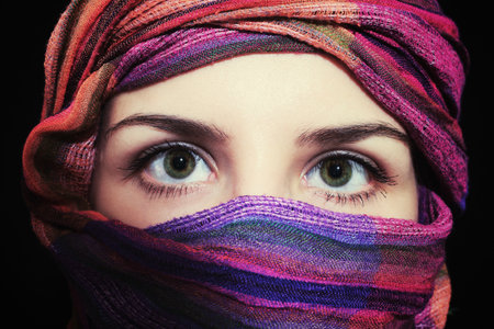 Close up portrait of a beautiful eastern woman with bright makeup and jewelry wearing headscarf.