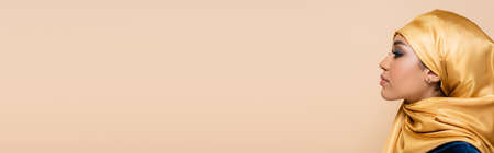 side view of muslim woman in yellow hijab with bright makeup isolated on beige, banner