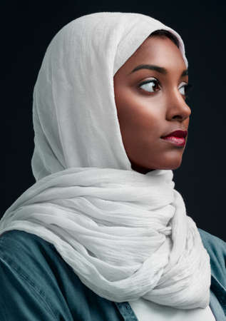 No one is you and that is your superpower. Cropped shot of an attractive young woman wearing a hijab and standing alone against a black background in the studio.