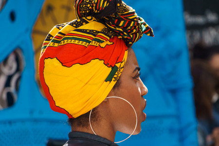 Closeup of a smiling young african origin woman with raised arms who holds her headdress made with a wrapping rainbow flag to celebrate LGBT pride day on a blurred tropical background