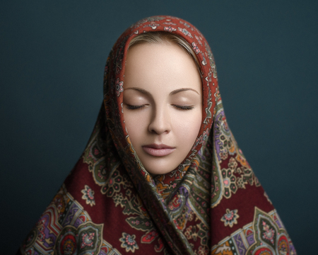 Stylish woman with smooth clean skin posing with burka in fashion portrait