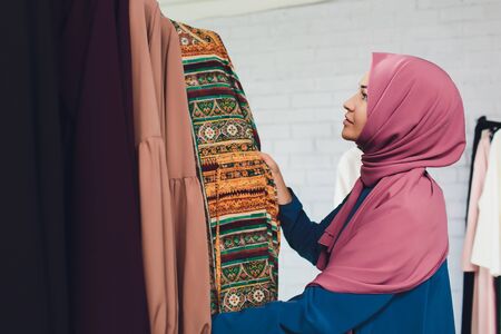 Arab woman in traditional Muslim clothes buys a new dress in an Oriental store.