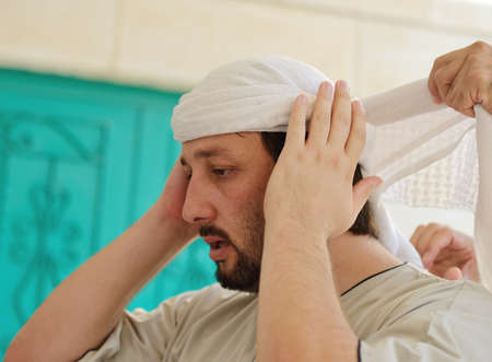 hands of Muslim mother putting on a hijab on her daughter . beautiful woman with perfect skin and professional make-up on her face wearing shawl turban