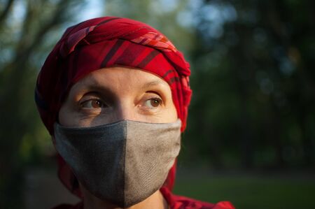 Mature woman wearing handmade textile face mask as accessory and protective element during sunny spring day in the park because of coronavirus pandemic