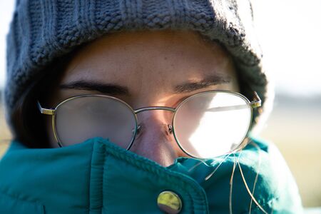Portrait of a young woman in misted glasses outdoors on a frosty snowy day