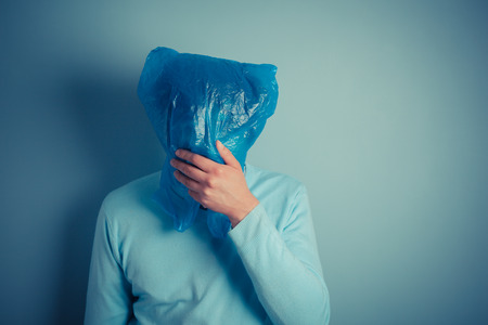 A man is wearing a plastic bag over his head