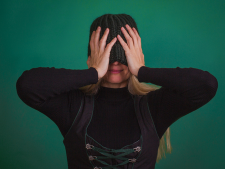 Woman holds his head with knitted in dark color hat with his hands, on the turquoise background.