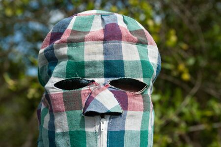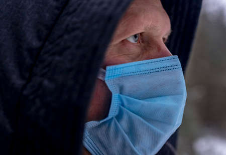 Adult caucasian man in face mask in nature alone.