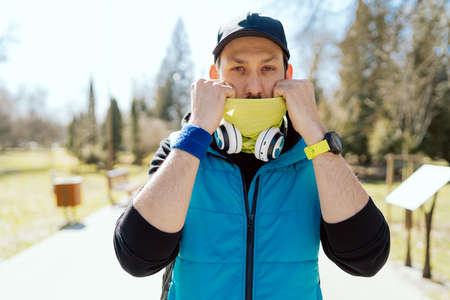 An athlete prepares to run. Sportsman warmly dressed slips chimney scarf over face, spring morning in public park, man training for marathon.