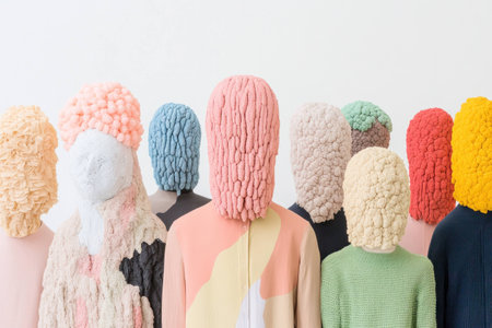 Woven knit hats in vibrant colors decorate the warm crowd generated by artificial intelligence