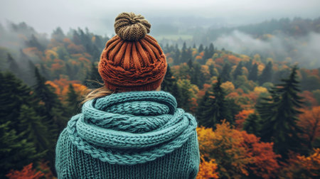 Woman in Cozy Knit Scarf and Beanie Overlooks Serene Autumn Forest Scenery, Fall Travel