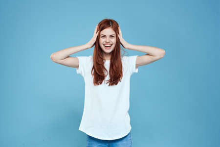 pretty woman white tshirt long hair glamor lifestyle cropped view blue background