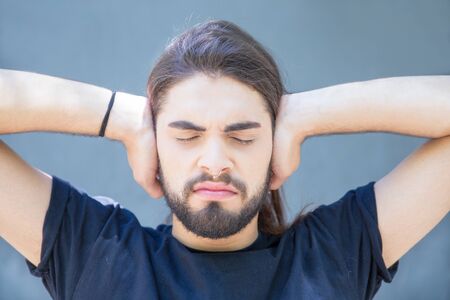 Unhappy frowning guy tired of loud sound. Stressed young man covering ears and closing eyes. Body language concept