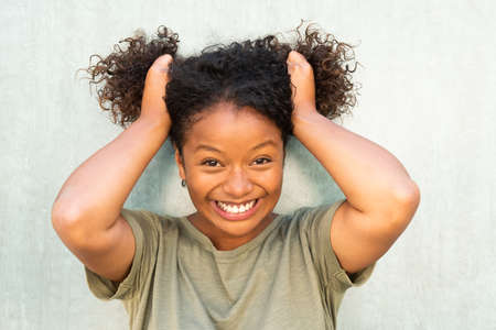 young woman to tie hair on gray background